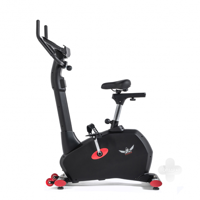 Тренажёр выполнен в стильном дизайне: бархатный чёрный цвет «разбавляют» ярко-красные вставки. Эта модель отмечена и логотипом производителя: крылатым значком DFC Cardio на боковой панели велотренажёра.